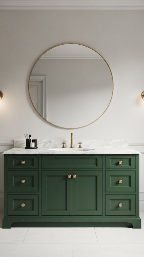 Finally, if you want your vanity to be the centerpiece of the bathroom, opt for bold colors. Deep navy, emerald green, or even vibrant coral can transform a simple vanity into a striking statement piece. Combine bold cabinetry with neutral walls and flooring to balance the look. Unique hardware, such as brass handles or geometric knobs, further enhances the visual impact. This idea is perfect for those who want a mix of functionality and personality in their bathroom space.