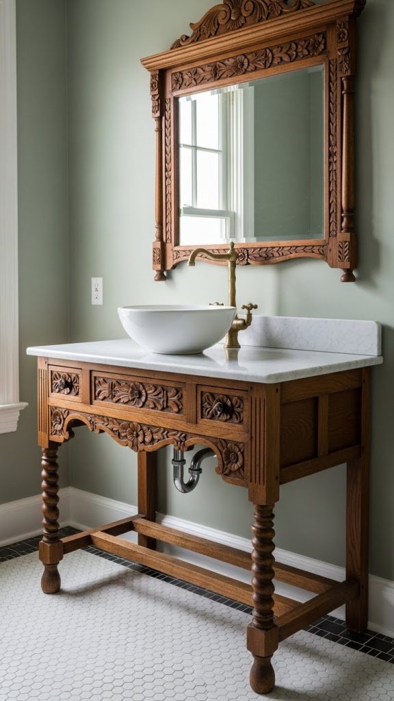 For those who love rustic charm and character, a vintage wooden vanity is a perfect choice. These vanities often feature intricate carvings, distressed finishes, and antique-style hardware, giving your bathroom a timeless appeal. Pairing a vintage vanity with a vessel sink or a marble countertop can blend old-world charm with modern functionality. Warm wood tones, such as oak or walnut, add richness and depth to the bathroom space.