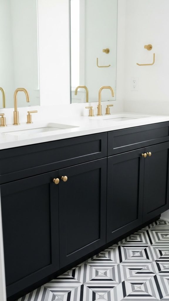 A black vanity can bring a bold, contemporary touch to your bathroom. Black cabinetry works especially well with brass, gold, or chrome fixtures, creating a high-contrast and visually striking space. Matte black finishes exude sophistication, while glossy finishes add a reflective, luxurious feel. Black vanities also pair beautifully with white or neutral walls, patterned tiles, or industrial-style lighting.