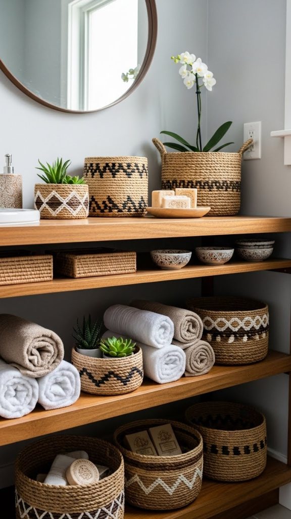 An open shelf vanity combines style and practicality. Instead of closed cabinets, these vanities feature open shelving to store towels, baskets, and decorative items. This design emphasizes accessibility and gives the bathroom a light, spacious feel. Open shelving works well with floating vanities or rustic wooden designs. Adding woven baskets or neatly folded linens creates a spa-like aesthetic that is both functional and visually pleasing.