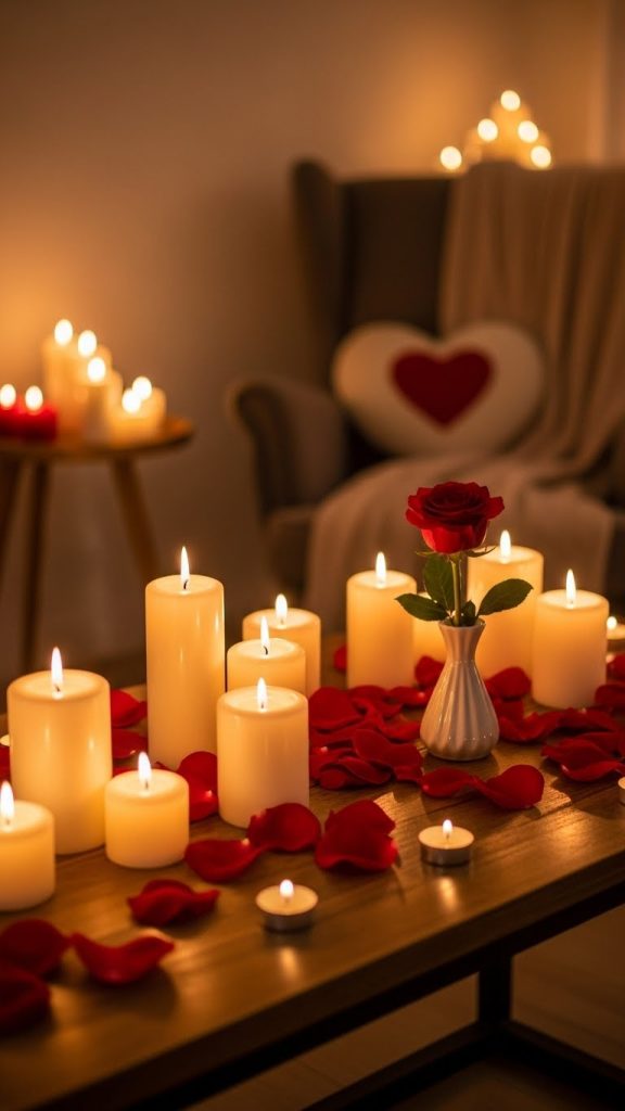 Candles instantly bring warmth and intimacy to any space. Creating a candlelight corner using scented candles, tea lights, or pillar candles in shades of red, blush, and ivory can elevate the romantic atmosphere. Arrange them on a tray, near a window, or on the dining table, and pair them with rose petals or fairy lights. The gentle flicker of candlelight adds softness and makes even simple spaces feel magical.