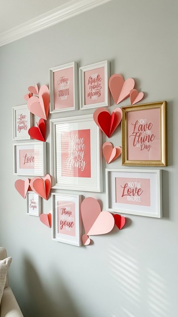 Wall décor is one of the easiest ways to reflect Valentine’s spirit. Heart-themed wall art—such as framed prints, handmade paper hearts, or fabric hangings—adds charm without overwhelming the room. You can create a collage of love quotes, photos, or minimalist heart illustrations. This idea works beautifully for bedrooms, living rooms, or even entryways.