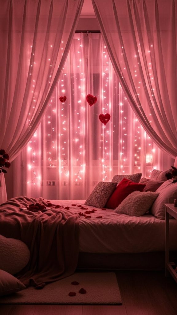 Fairy lights are perfect for adding a dreamy glow to Valentine décor. Drape them over curtains, headboards, shelves, or mirrors to instantly warm up the space. Warm white or soft pink lights work best for a romantic theme. Pair them with sheer fabric or tulle to enhance the softness and create a cozy, love-filled environment.