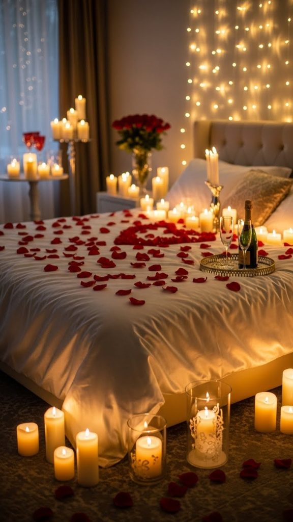 Transforming the bedroom into a romantic retreat is a classic Valentine idea. Use soft bedding, rose petals, candles, and subtle lighting to set the mood. Adding sheer curtains around the bed or a heart-shaped arrangement on the wall behind it can create a hotel-like romantic ambiance that feels luxurious yet intimate.