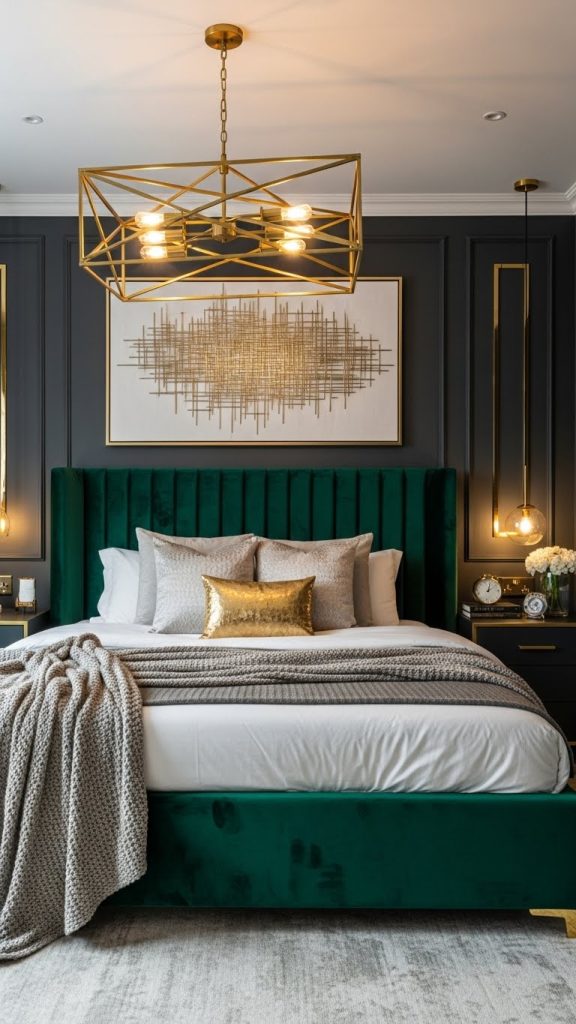 If you love the feeling of a high-end hotel, modern luxury might be your style. Think bold statement lighting, velvet fabrics, metallic accents, and plush bedding. Dark colors like charcoal, navy, or emerald add sophistication.
