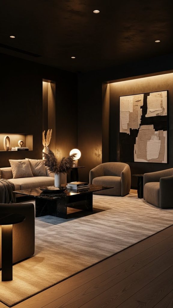 10. Matte Black Wall with Warm Beige Lighting