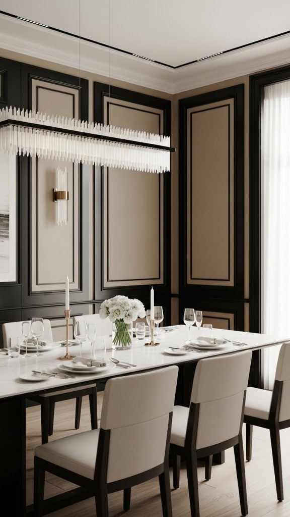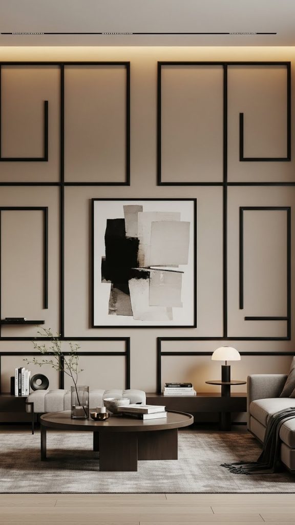 Adding black panel molding or trim over beige walls is a sophisticated way to elevate your interior design. This idea works especially well in classic or modern-luxury spaces. The beige base keeps the room soft and welcoming, while black lines add structure and architectural interest. This design is ideal for dining rooms, hallways, or formal living areas.