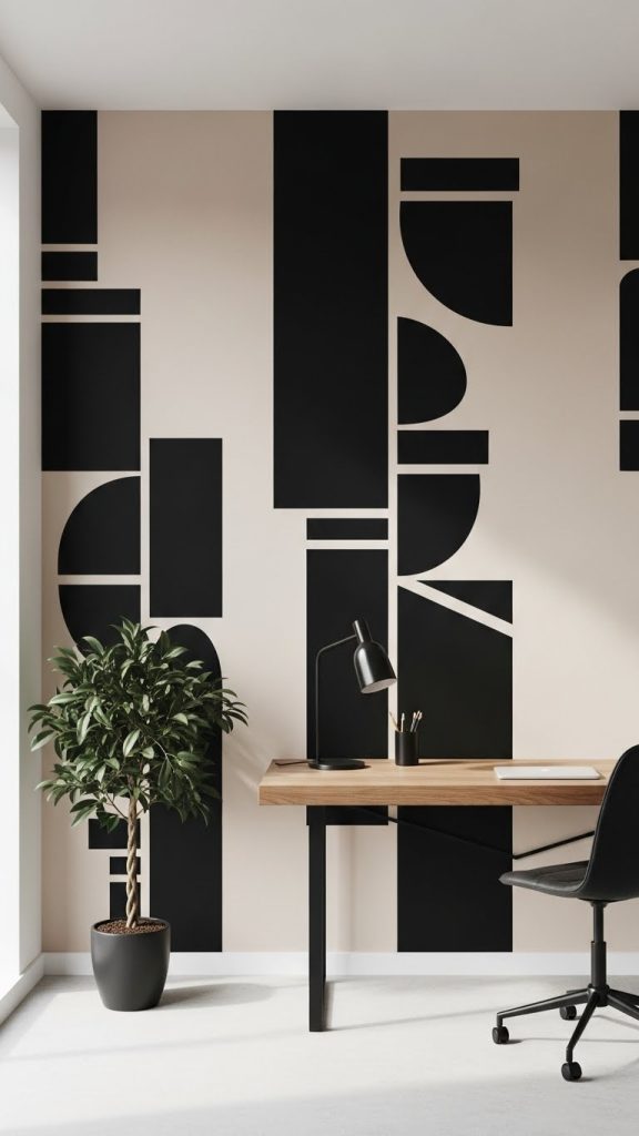 Geometric wall designs in black and beige create a modern and artistic look. Think sharp lines, triangles, arches, or abstract shapes painted directly onto the wall. Beige acts as the base color, while black defines the pattern. This style works well in creative spaces such as home offices, teen bedrooms, or modern living rooms, adding personality without clutter.