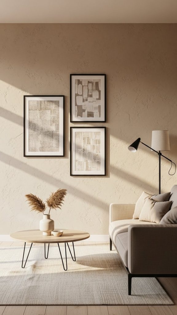 4. Textured Beige Walls with Black Art Accents