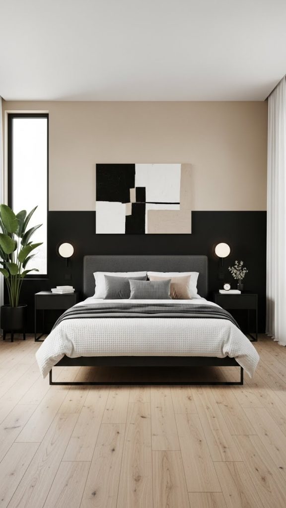 A two-tone wall design splits the wall horizontally, using black on the lower half and beige on the upper half, or vice versa. This approach adds visual structure and makes walls appear taller or wider depending on placement. It’s a great option for corridors, bedrooms, or dining spaces. A thin black or beige trim between the colors enhances the polished look.