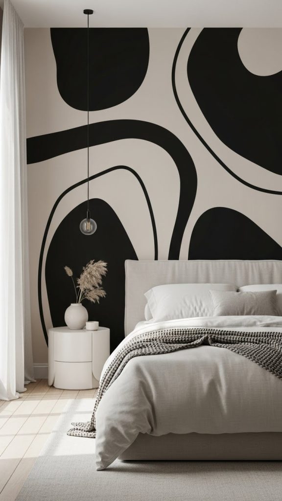 Minimalist murals featuring abstract lines, arches, or organic shapes in black over a beige base are perfect for modern interiors. These murals add artistic charm while keeping the space calm and uncluttered. This idea works well in bedrooms, reading corners, or living rooms where you want a relaxed yet stylish atmosphere.