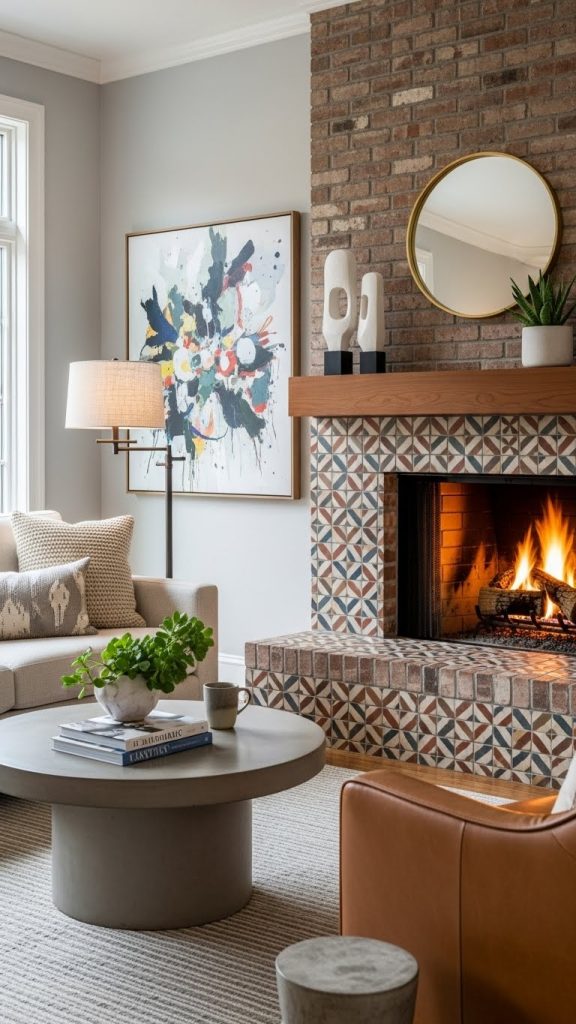 Combining brick with tile adds texture and visual interest. You can tile the hearth, surround, or even insert tile patterns into specific sections of the fireplace. Patterned tiles, subway tiles, or handmade ceramic tiles can elevate the look and blend classic brick with modern design elements.
