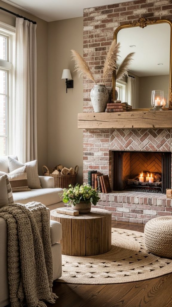 Sometimes the brick itself doesn’t need changing—adding or upgrading the mantel can completely transform the fireplace. A chunky reclaimed wood beam instantly adds warmth and rustic charm, while a sleek floating wooden mantel works beautifully in modern homes. The contrast between brick and wood creates visual balance and makes the fireplace feel more intentional and styled.