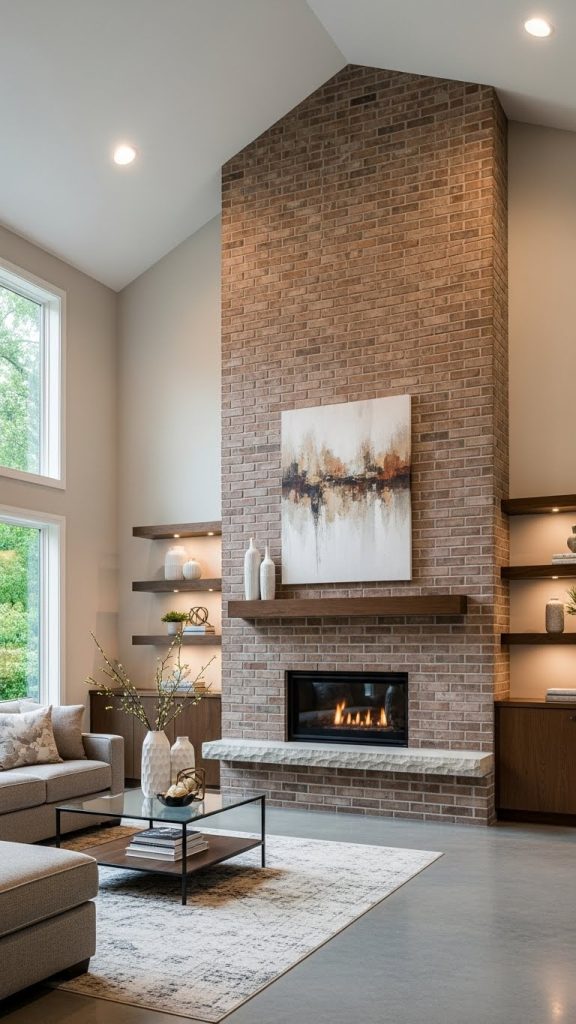 Extending the brick from floor to ceiling creates a bold architectural feature. This makeover emphasizes height and draws the eye upward, making the room feel more spacious. Whether painted, whitewashed, or left natural, a full-height brick fireplace feels custom and high-end. It works especially well in living rooms with vaulted or high ceilings.
