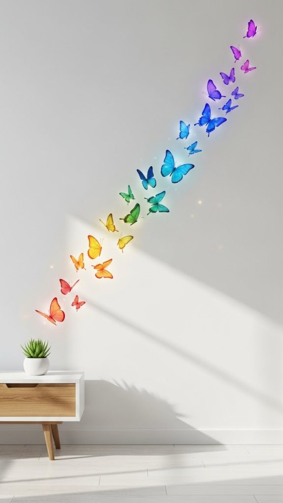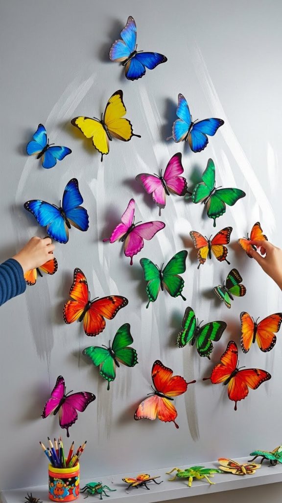 Take butterfly décor one step further by making it interactive. Use magnetic paint or attach small magnets to butterflies and the wall, allowing them to be repositioned at will. This transforms your wall into a constantly changing canvas, ideal for kids’ rooms, craft rooms, or creative studios.
