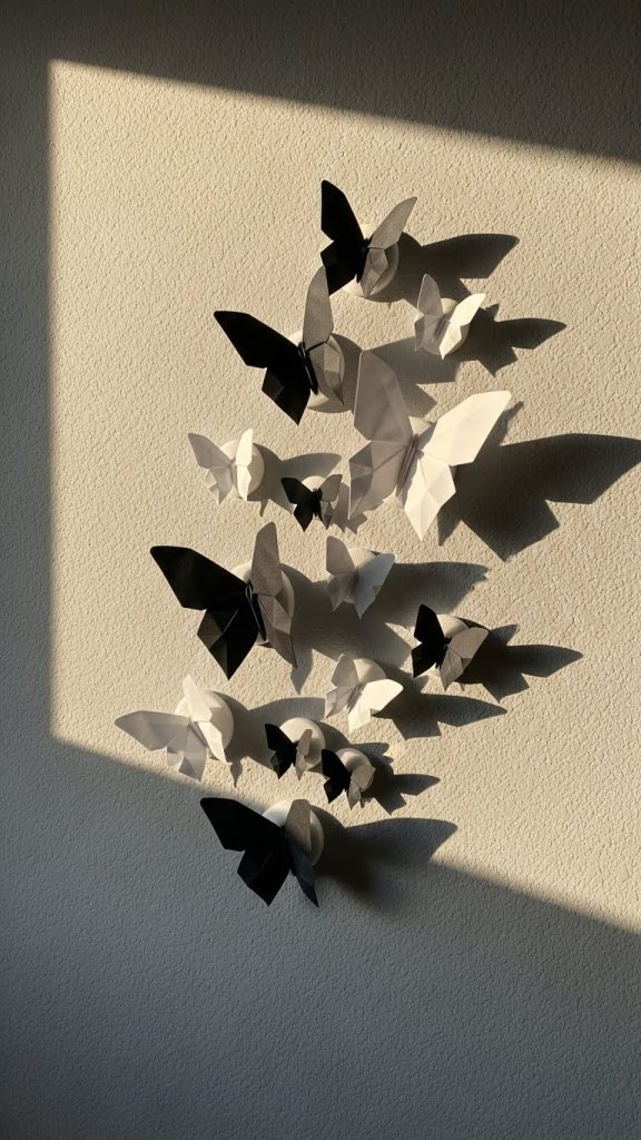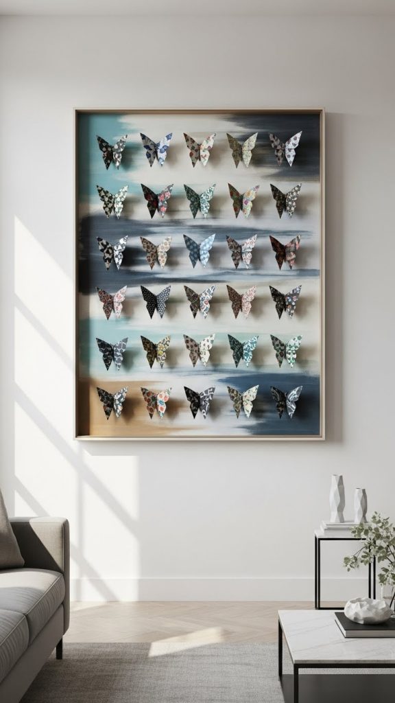 Instead of placing butterflies in a straight line, consider creating a clustered 3D effect. Select a color palette—monochrome or pastel tones work well—and arrange the butterflies in an organic cluster pattern. Layering butterflies at different depths by using foam pads or small cubes behind them gives the artwork depth and makes it look more dynamic.
