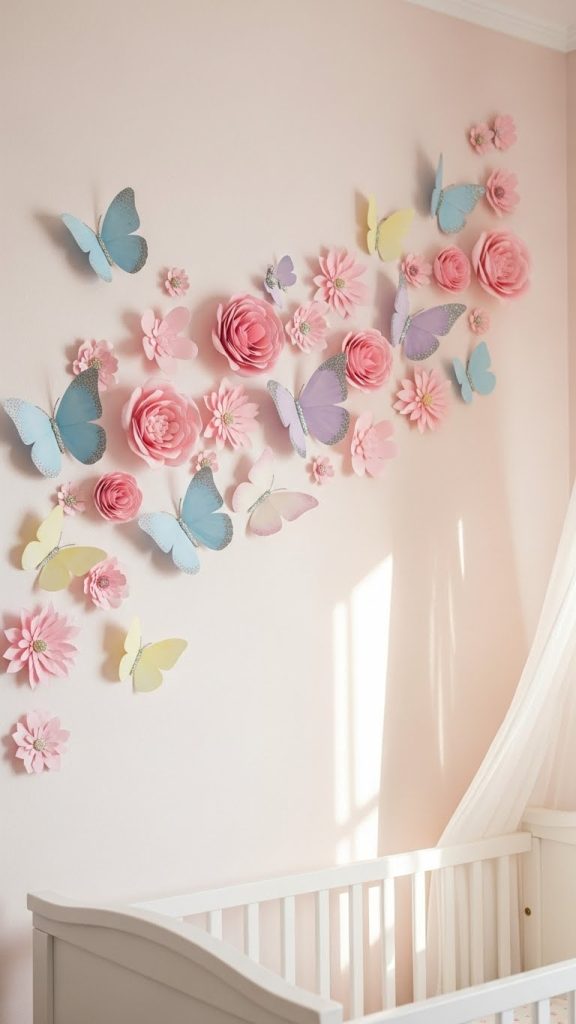 Combine origami butterflies with paper flowers for a dreamy, garden-like wall installation. Create flowers using tissue paper, cardstock, or crepe paper and intersperse the butterflies among the blooms. Using complementary colors enhances the visual appeal. For instance, soft pink flowers with white and pastel butterflies create a calming, ethereal vibe.