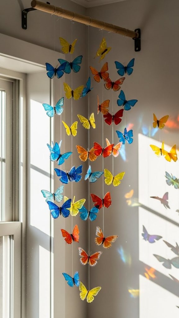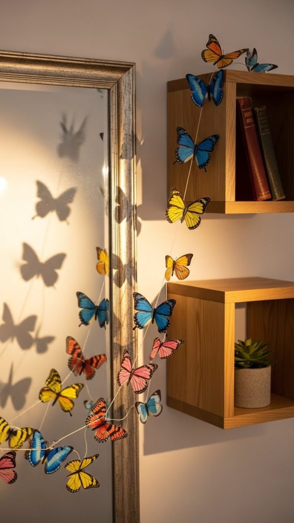 A butterfly garland is a versatile decoration that can be draped across walls, mirrors, windows, or shelves. Thread small butterflies onto a thin string or ribbon, leaving some space between them. You can hang multiple garlands side by side or staggered for a more intricate display.