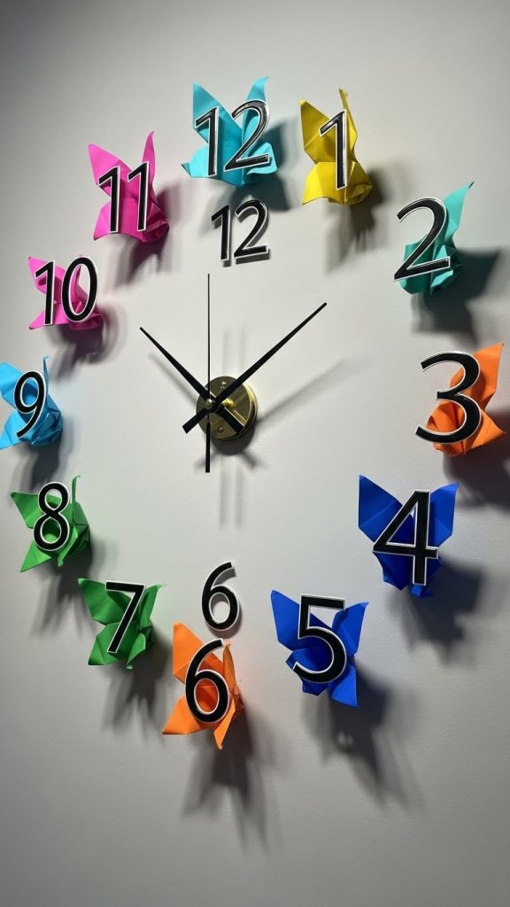Integrate origami butterflies into a functional piece of décor by creating a butterfly wall clock. Arrange the butterflies in a circular pattern around the clock mechanism, replacing numbers or filling the spaces between them. Choose colors that contrast with your wall for visual clarity.