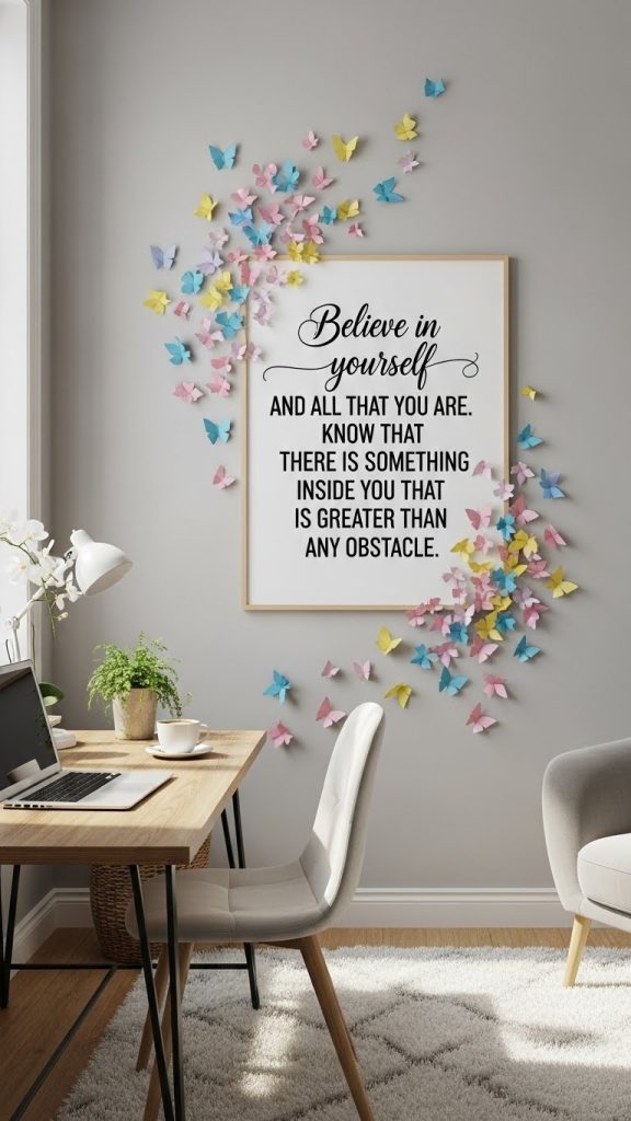 This décor idea is ideal for home offices, study areas, or living spaces where you want to combine art with words. The butterflies add a 3D, tactile element to an otherwise flat wall design.