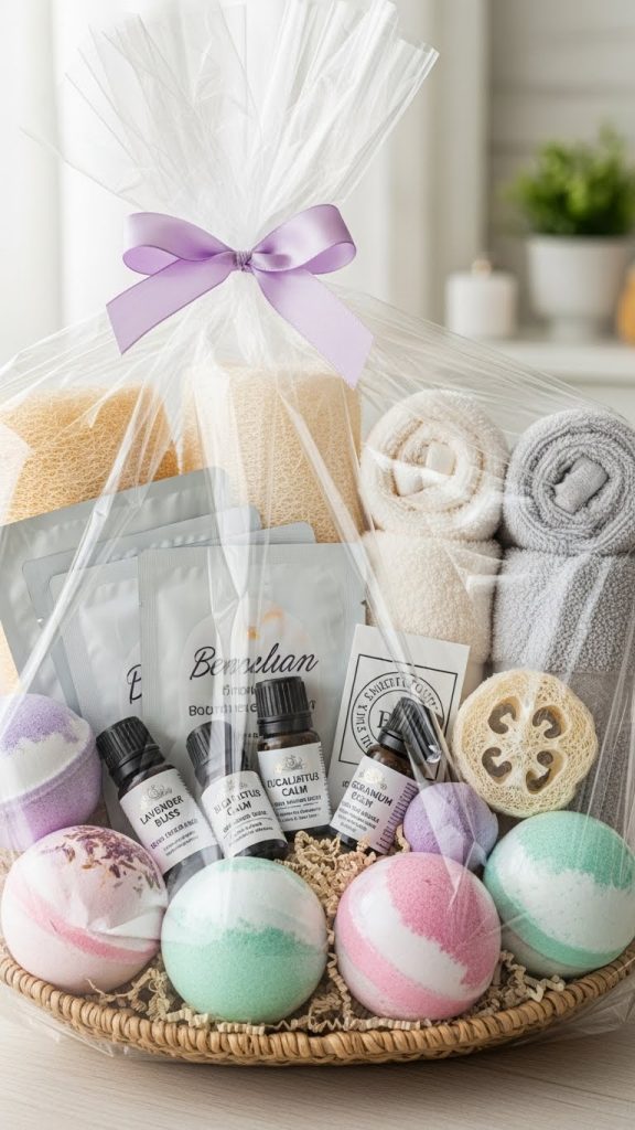 Combine bath bombs, luxurious lotions, face masks, and essential oils.