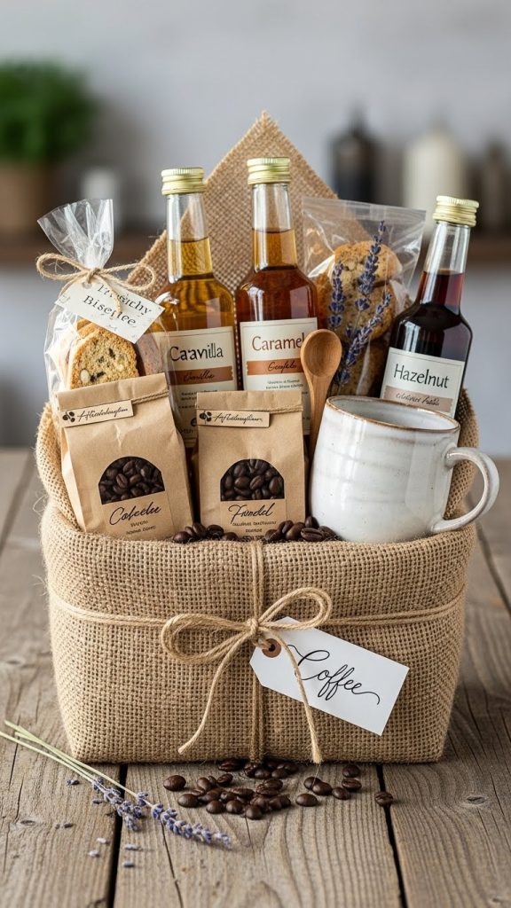 Include gourmet coffee beans, flavored syrups, biscotti, and a stylish mug.