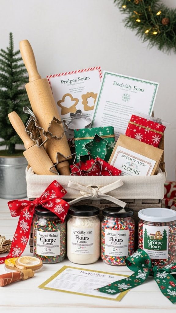 Gather specialty flours, festive cookie cutters, sprinkles, and a wooden rolling pin.