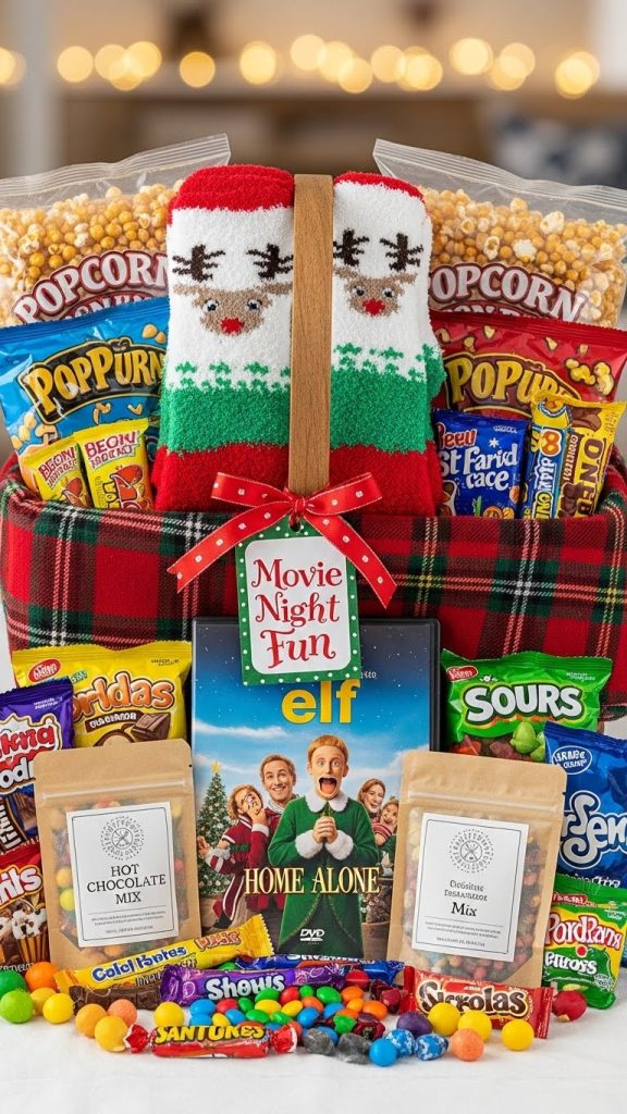 Offer popcorn kernels, seasoning mixes, candy, hot chocolate packets, and cozy socks.