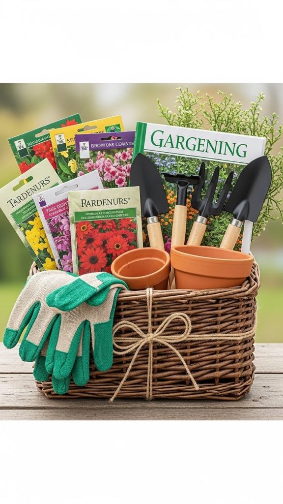 Fill with packets of winter-hardy seeds, gardening gloves, small tools, and hand cream.
