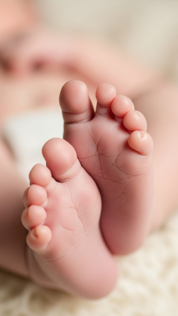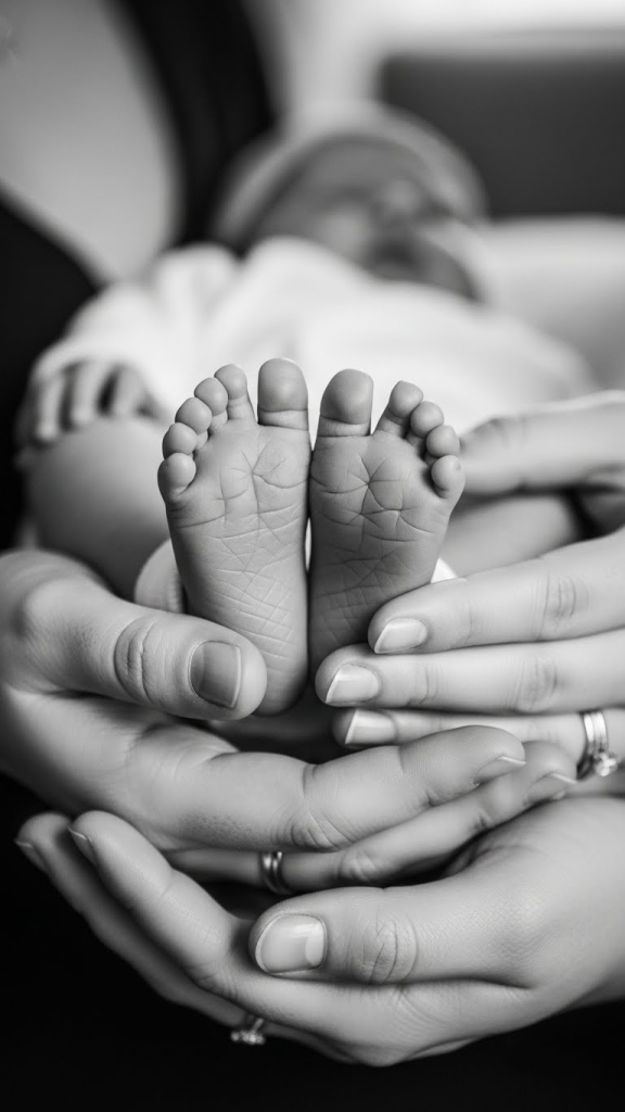 - Focus closely on the contrast between adult hands and the baby’s tiny features.