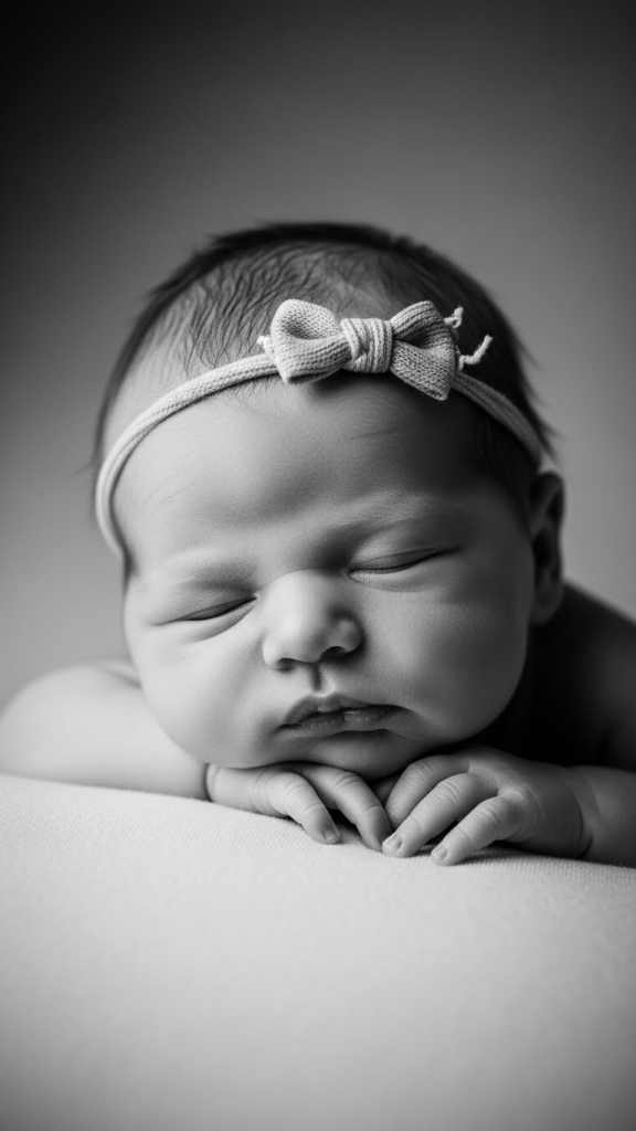 Black and white newborn portraits emphasize emotion, light, and shadow. They remove the distraction of color and create a timeless, gallery-style look.