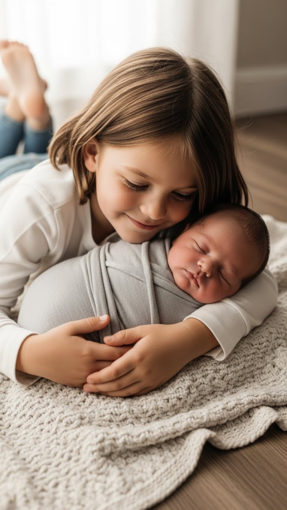 If the baby has an older brother or sister, a sibling portrait becomes a treasured family photograph. Safety is the top priority here: keep poses simple and supported, especially with very young siblings.