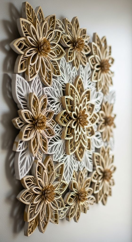 Cut toilet paper rolls into rings, shape them into petals, and glue them together to create stunning floral wall art. Paint them in metallic or pastel shades for a modern touch.