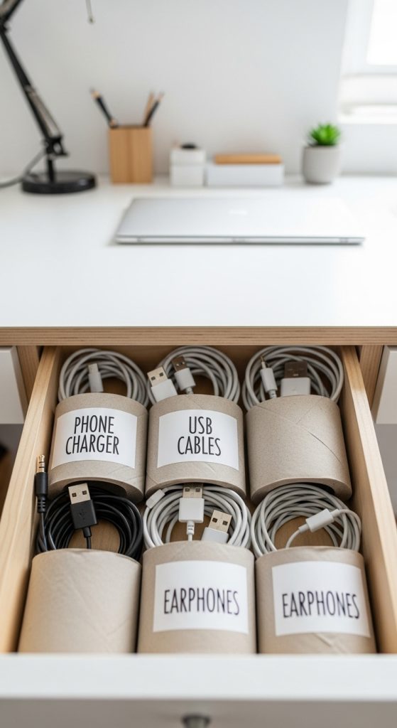Cut small holes in a decorated toilet paper roll and thread your phone charger or earphones through it. Label each one to keep your cords tangle-free.