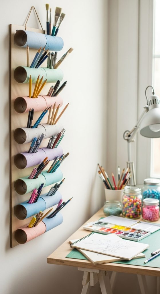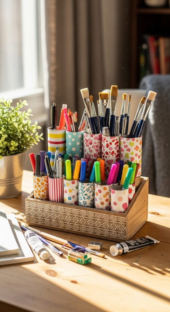 Wrap toilet paper rolls in patterned paper or fabric and place them in a small box to organize pens, pencils, and brushes.