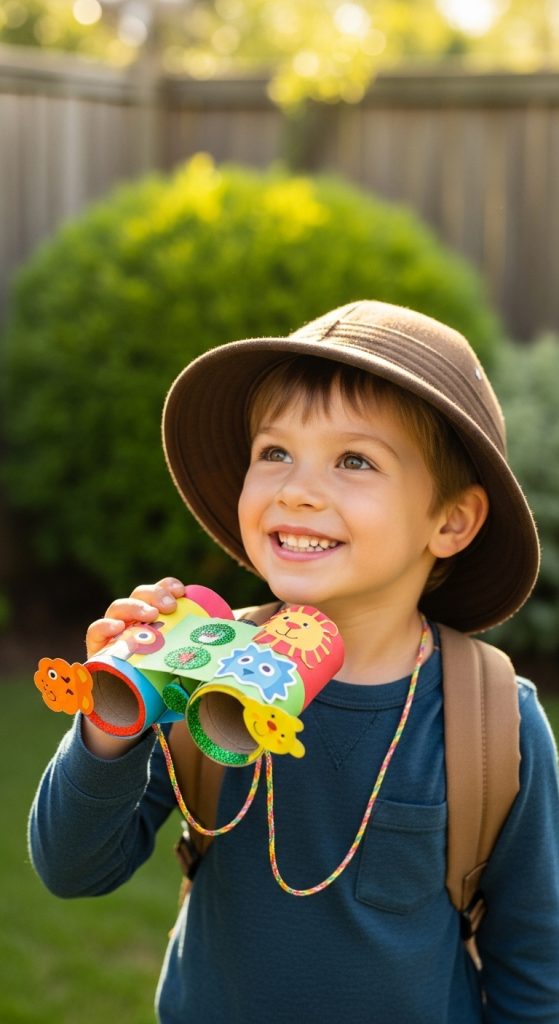 Glue two rolls side by side, wrap them in colorful paper, and add a string around the neck. Kids will love pretending to be explorers or adventurers.
