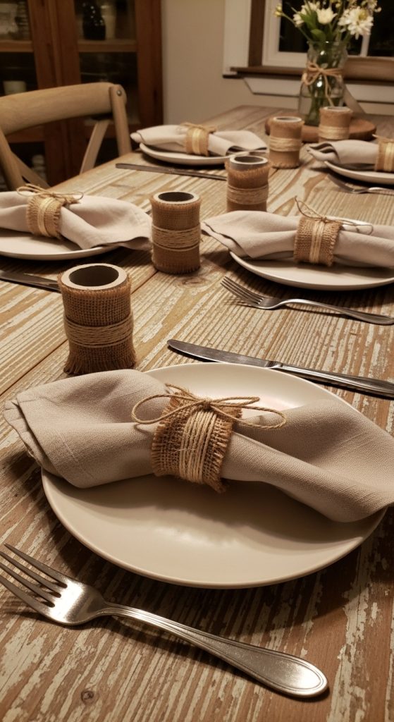 Cut the roll into smaller rings and wrap them with burlap, twine, or ribbon for rustic-style napkin holders.