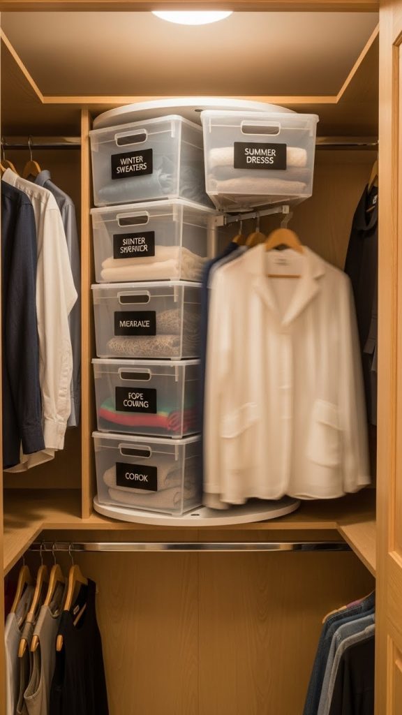 Store off-season clothes in bins or vacuum-sealed bags on the top shelf. Rotate items as seasons change. This keeps daily clothing accessible while reducing clutter in your main closet area.