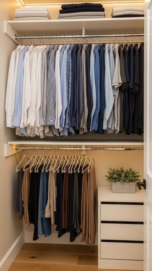 One of the easiest ways to double closet space is by adding a second hanging rod below the existing one. Use a tension rod or install a lightweight rod. This works perfectly for shirts, tops, skirts, and kids’ clothing, instantly doubling hanging capacity.