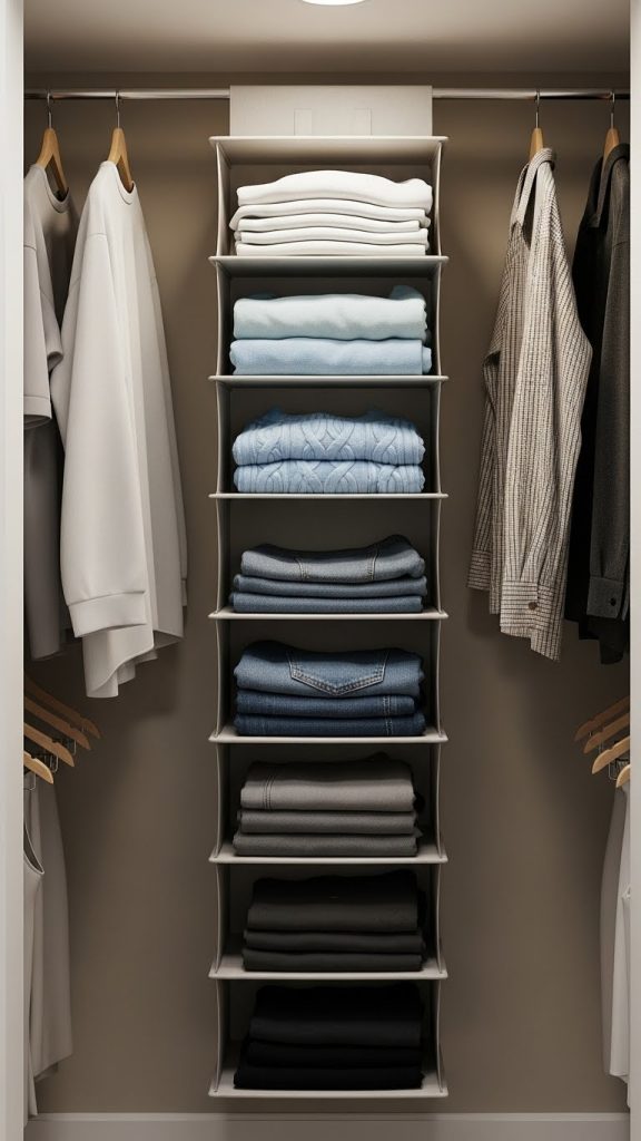 Hanging shelf organizers are perfect for sweaters, jeans, and bags. You can DIY one using sturdy fabric and cardboard inserts or buy an affordable hanging organizer and customize it. These organizers maximize vertical space without any permanent installation.