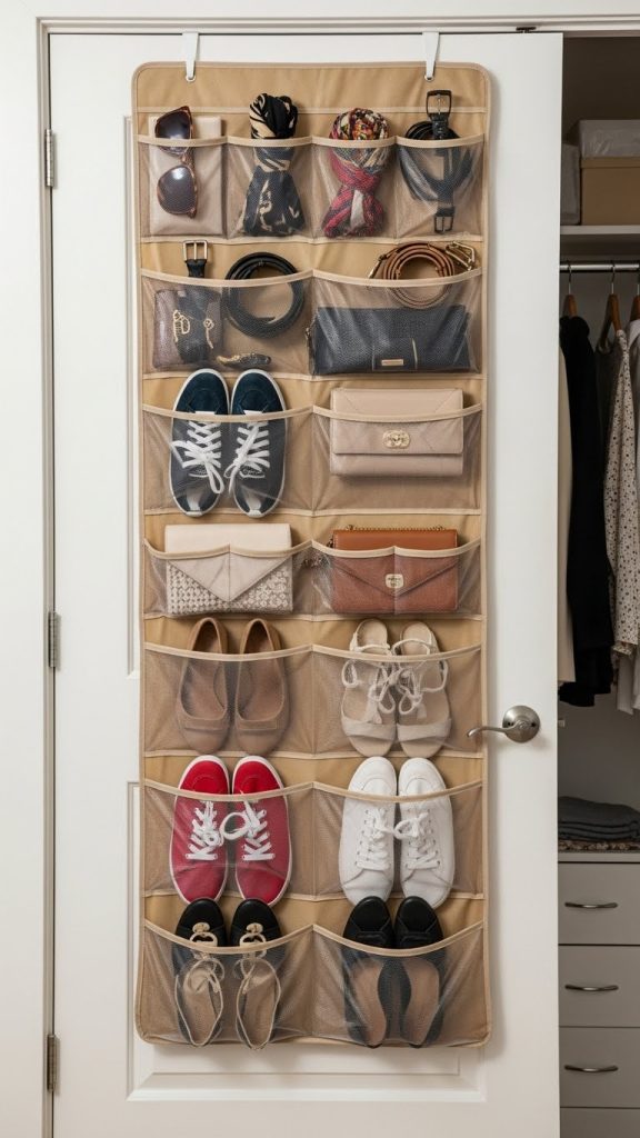 An over-the-door organizer isn’t just for shoes. Use it to store scarves, belts, socks, small bags, or accessories. Clear pockets help you see everything at a glance, making it easier to keep the closet tidy.