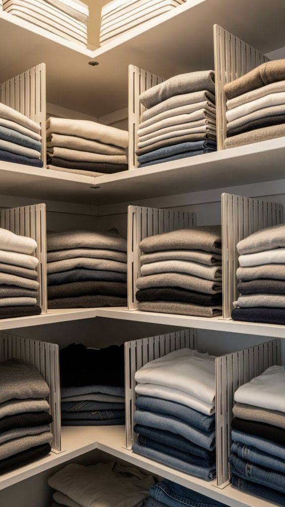 Closet shelves often turn into messy piles. DIY shelf dividers using acrylic sheets, cardboard covered in fabric, or repurposed bookends. These dividers keep stacks of clothes neat and prevent items from toppling over.