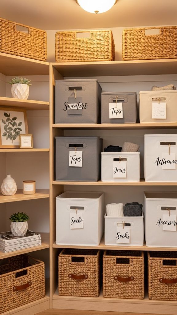 Baskets are ideal for organizing small or awkward items like workout clothes, pajamas, or accessories. Label each basket so everything has a designated home. Place baskets on shelves or the closet floor for quick access.