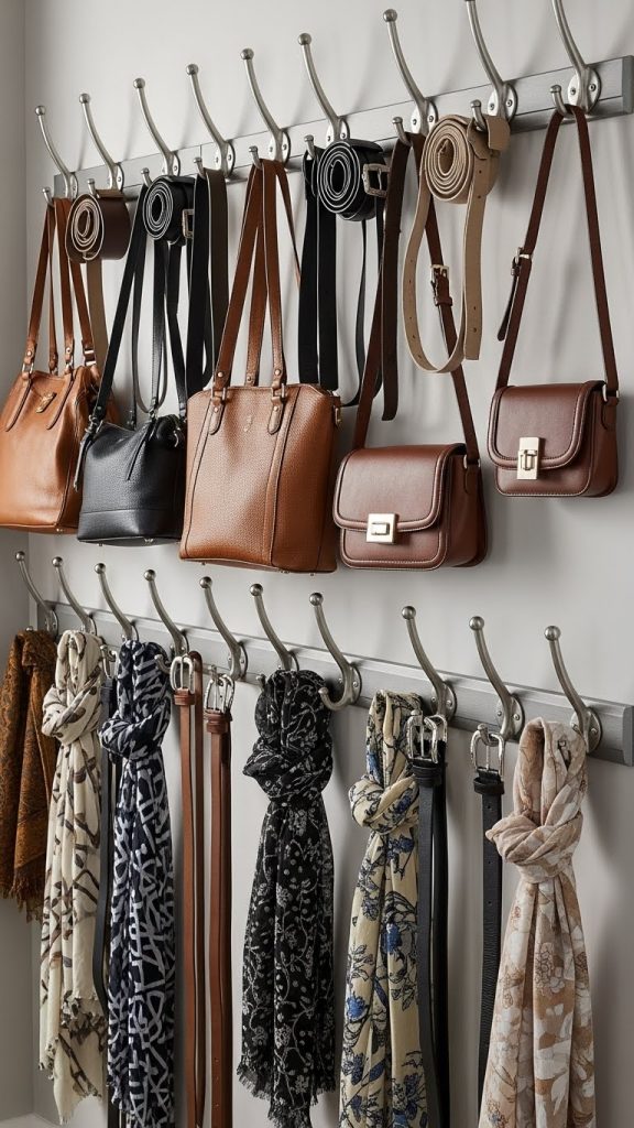 Install hooks or adhesive hooks on closet walls or doors. Hang handbags, hats, belts, and scarves vertically. This saves shelf space and keeps accessories wrinkle-free and easy to find.