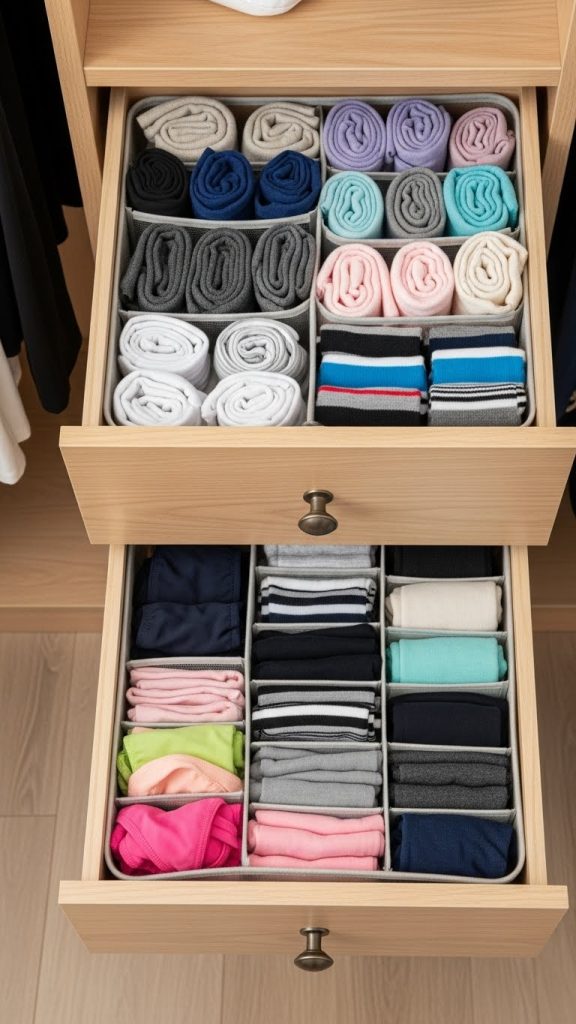 If your closet has drawers, use DIY or store-bought drawer dividers. You can create your own using cardboard or foam board. These inserts help separate socks, underwear, and accessories so drawers stay neat.