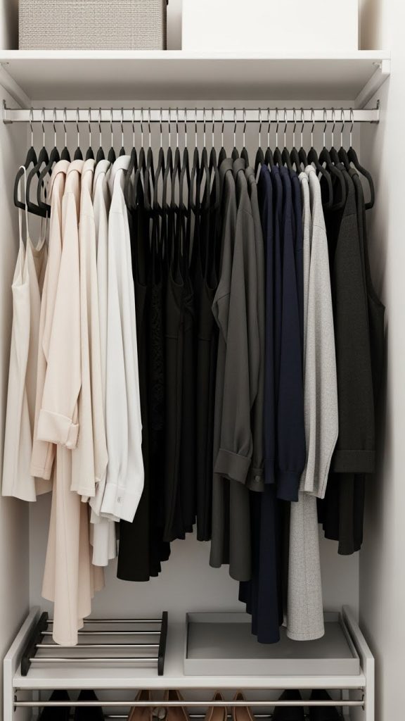 Replace bulky hangers with slim velvet or plastic hangers. This simple change creates more hanging space instantly. Uniform hangers also make the closet look cleaner and more organized.