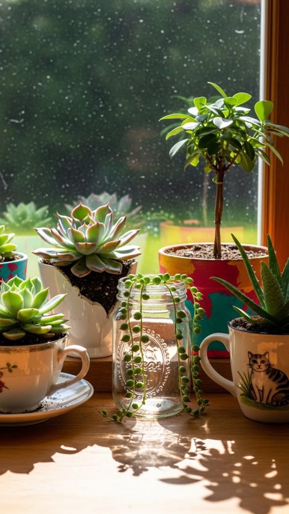 You can also use jars, teacups, or tin cans as quirky, inexpensive planters. The presence of plants can improve the atmosphere, boost mood, and add a touch of elegance to your room for very little money.