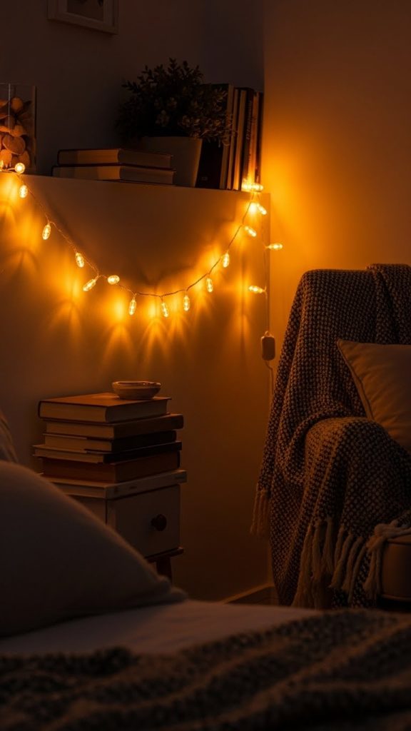 Lighting dramatically affects the mood and look of a room. Swap harsh overhead lights for soft, ambient lighting using string lights, fairy lights, or inexpensive LED lamps. These small changes can make the room feel warm, cozy, and inviting.