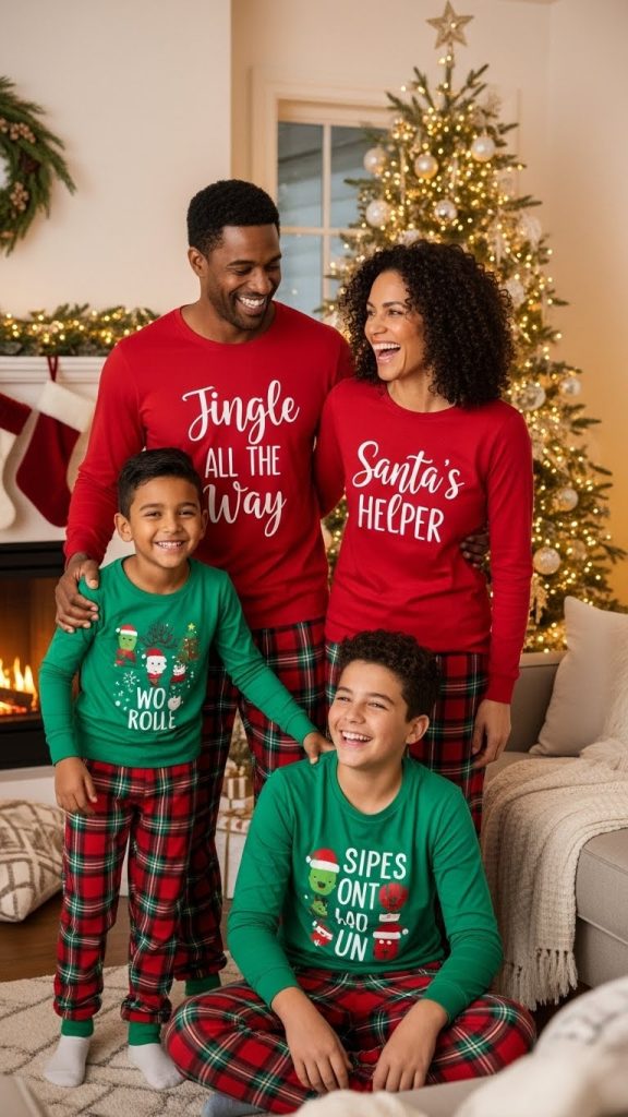 Pair Christmas shirts with pajama bottoms for humorous, coordinated family loungewear.