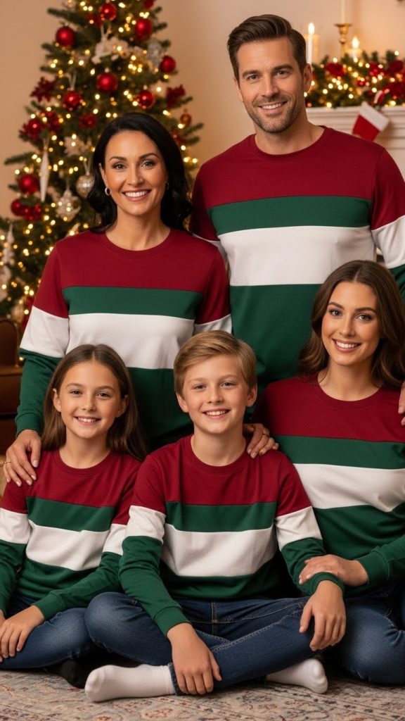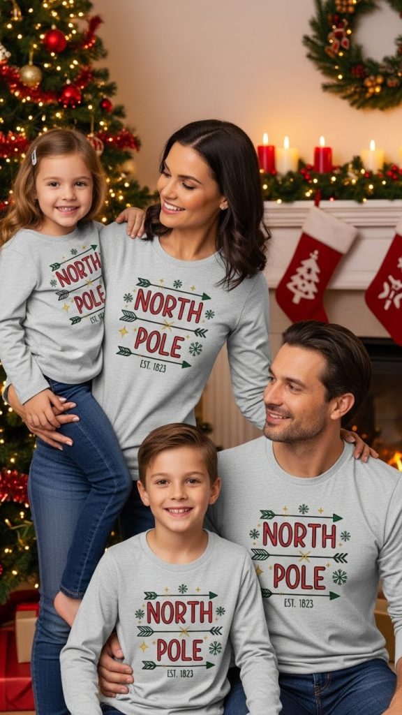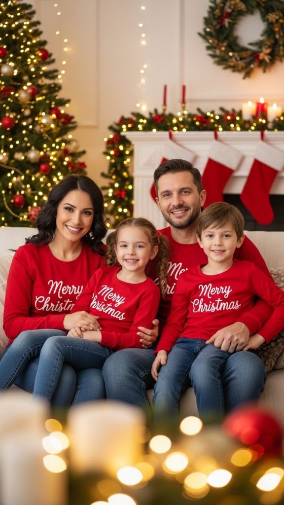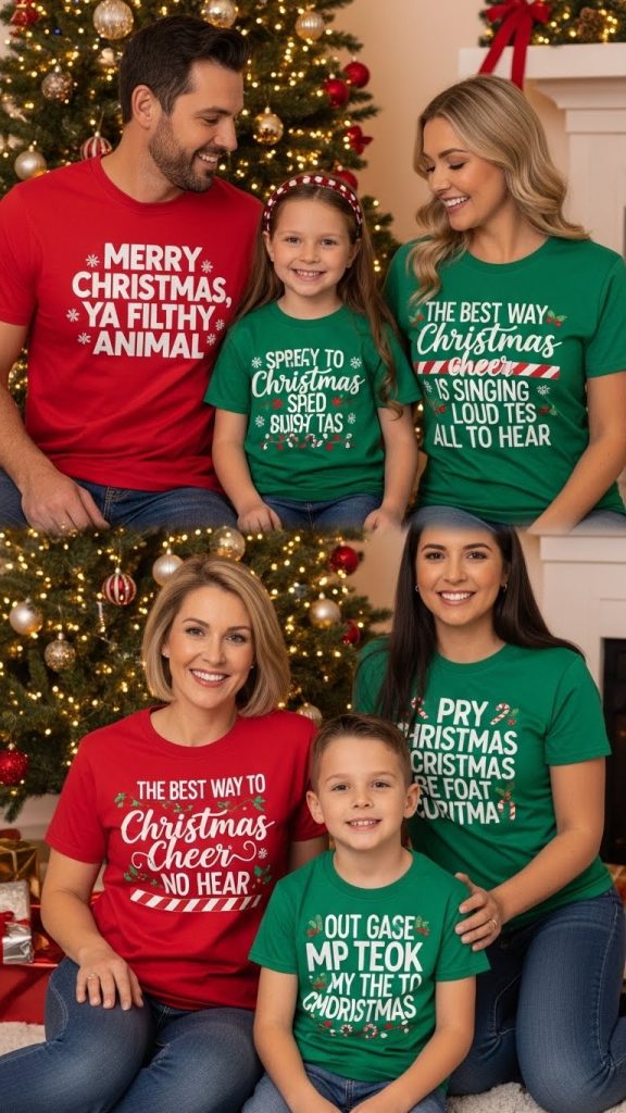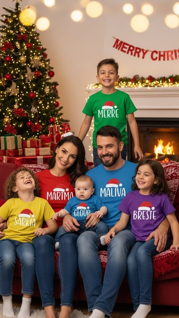 Keep it simple with matching shirts featuring “Merry Christmas” text in festive fonts, perfect for family photos and parties.